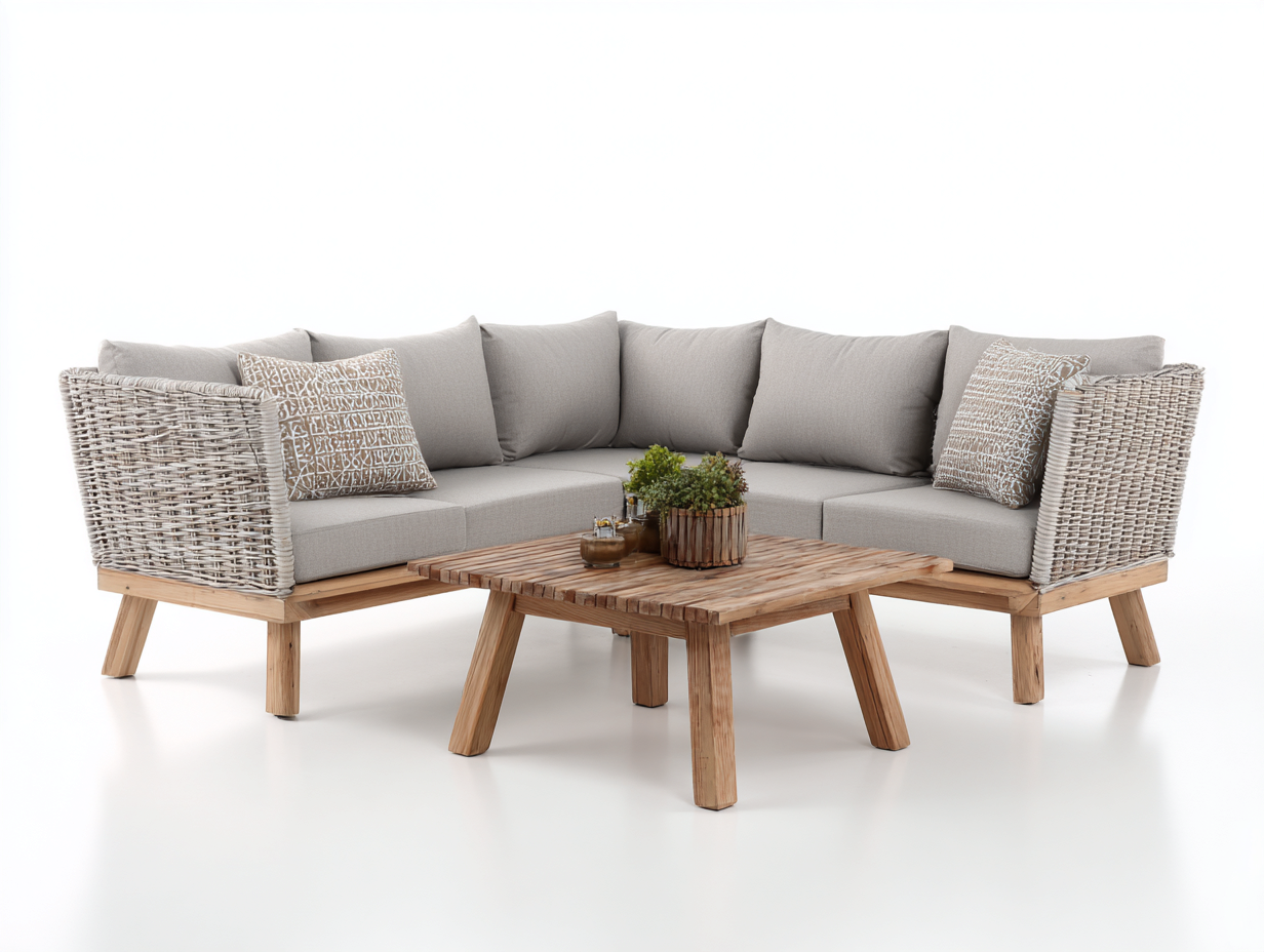 Dieses Gartensofa bietet eine komfortable Sitzlösung für Garten, Terrasse oder Balkon. Das symmetrische Eckdesign mit gleich langen Seiten schafft eine großzügige Loungefläche und eignet sich ideal für entspannte Stunden im Freien oder gesellige Treffen im Außenbereich. Die Kombination aus Polyrattan und Holz verleiht dem Möbelset eine natürliche und moderne Ausstrahlung.